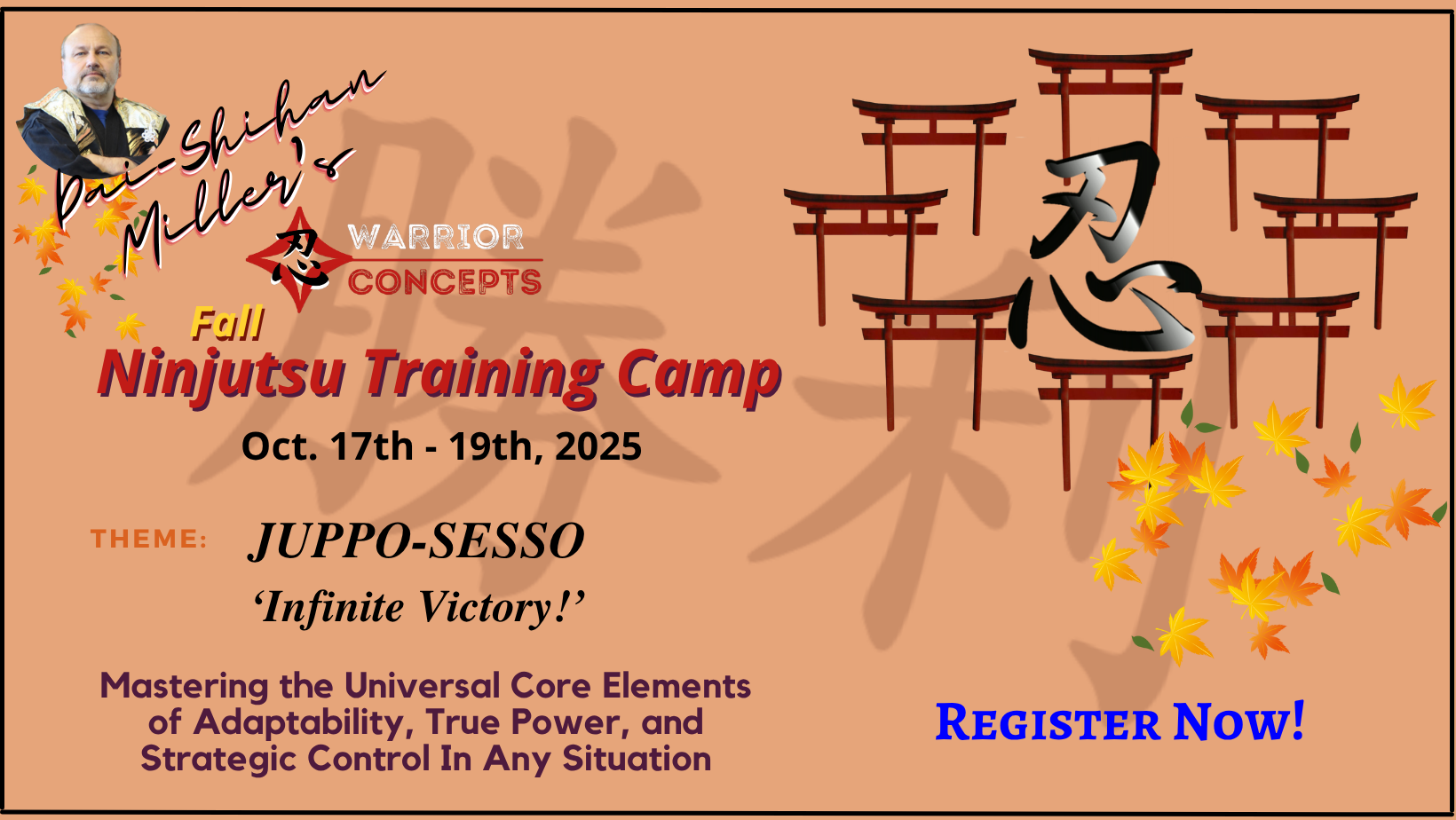 Join Dai-Shihan Miller, one of the longest-training Ninjutsu master-teachers in the Western-world and a direct student of Soke Masaaki Hatsumi, and his guest instructors to unlock the full power of your potential at this year's NINJA no AKI O'MATSURI:  Fall Ninja Camp Weekend Intensive.  This isn’t just another martial arts camp or seminar—this is a transformative experience that will guide you on the Path to True Mastery.